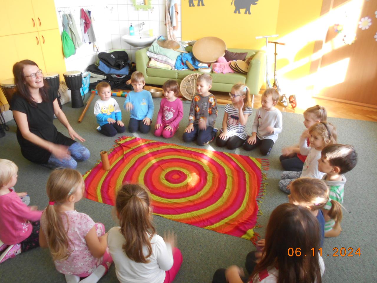 Ve středu 6.11.2024 se i děti z naší MŠ zúčastnily programu věnovanému hudbě, netradičním hudebním nástrojům a hudební terapii. Děti si mohly vyzkoušet nejen bubnování na bubínky, chrastit vajíčky, zahrát na tělo, zatančit v rytmu šamanského bubínku, ale také pošeptaly svá přání do kouzelného zvonečku, který jistě zařídí jejich splnění. Závěr patřil zážitku s tibetskou mísou. Všem se program líbil a děti se vrátily zpět do školky jako očarované dobrou energií.