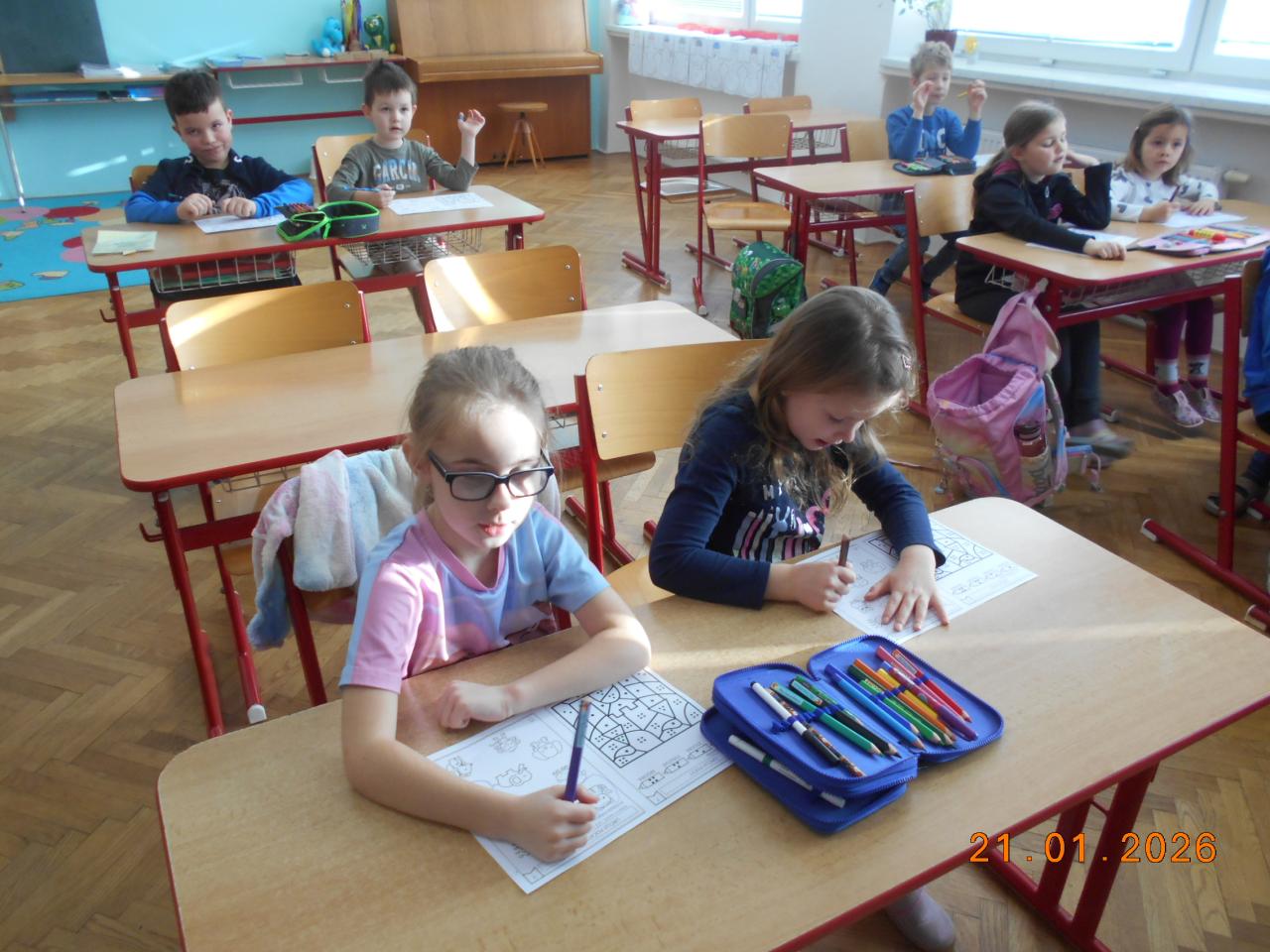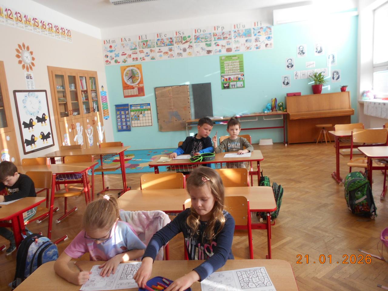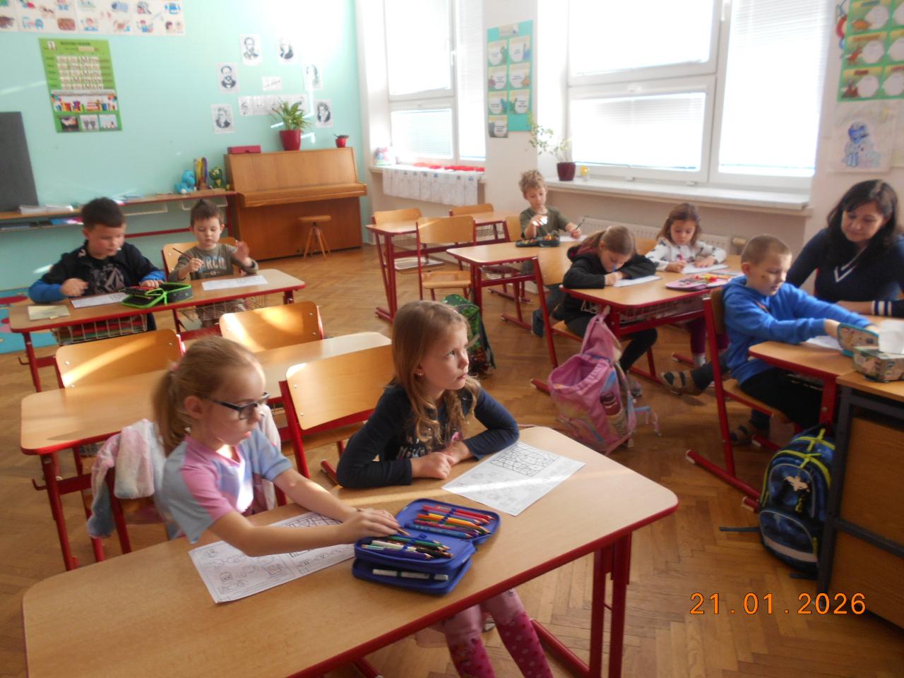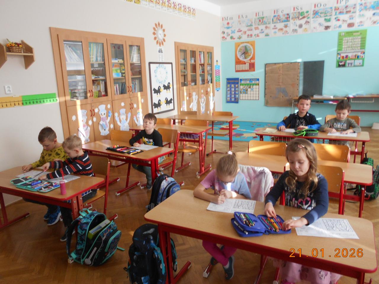 Ve středu 21.ledna jsme s předškolními dětmi navštívili naše kamarády v první třídě. Děti se seznámily s paní učitelkou, prohlédly si třídu, vyzkoušely sezení v lavicích a společně s prvňáčky se zapojily do plnění úkolů. Barvičky, písmenka, troška počítání, ve skupinkách i samostatně. Děti si vyzkoušely, jak zajímavé učení může být. Všichni plnili úkoly s velkým nadšením a měli ze setkání viditelnou radost.