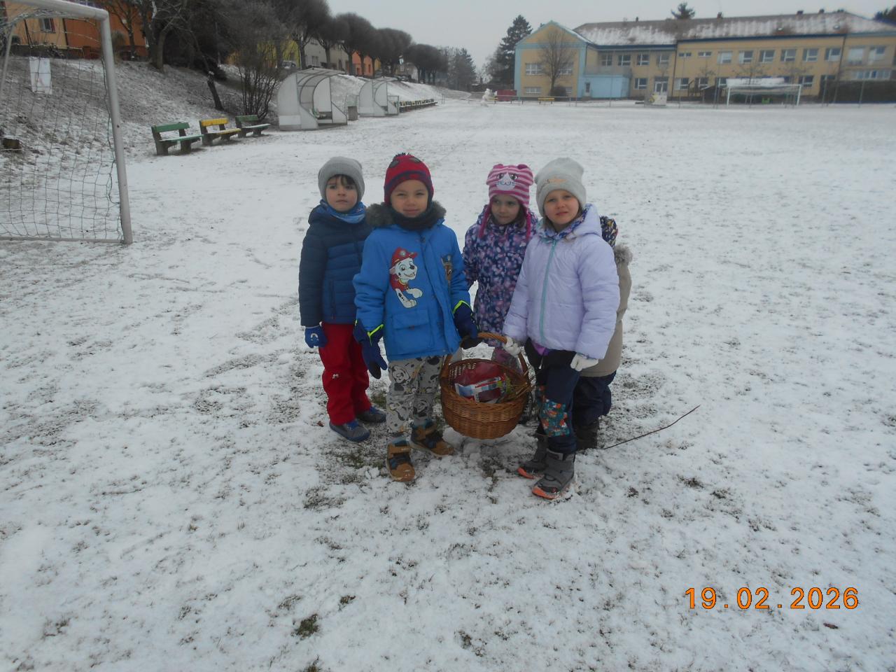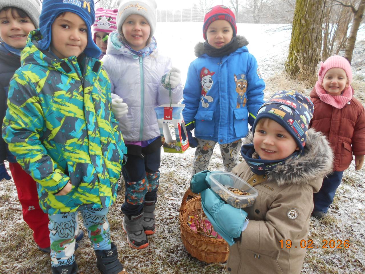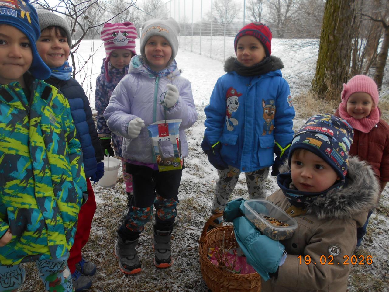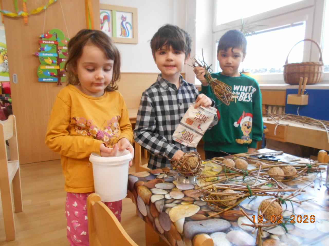 Děti se ve vzdělávacím videu dozvěděly, které druhy ptáčků můžou u krmítka vidět a také, které krmivo jim prospěje a co by jim mohlo uškodit. Každý přinesl nějakou vhodnou ptačí pochoutku, vytvořili jsme krmítka a ta jsme rozvěsili kolem školky. Teď můžeme sledovat, kdo na naši hostinu přiletí. Průběžně budeme krmítka pozorovat a doplňovat, protože zatím zimní příroda ptákům mnoho potravy nenabízí. Zima již pomalu končí, ale pečovat o naše opeřence můžeme celý rok.