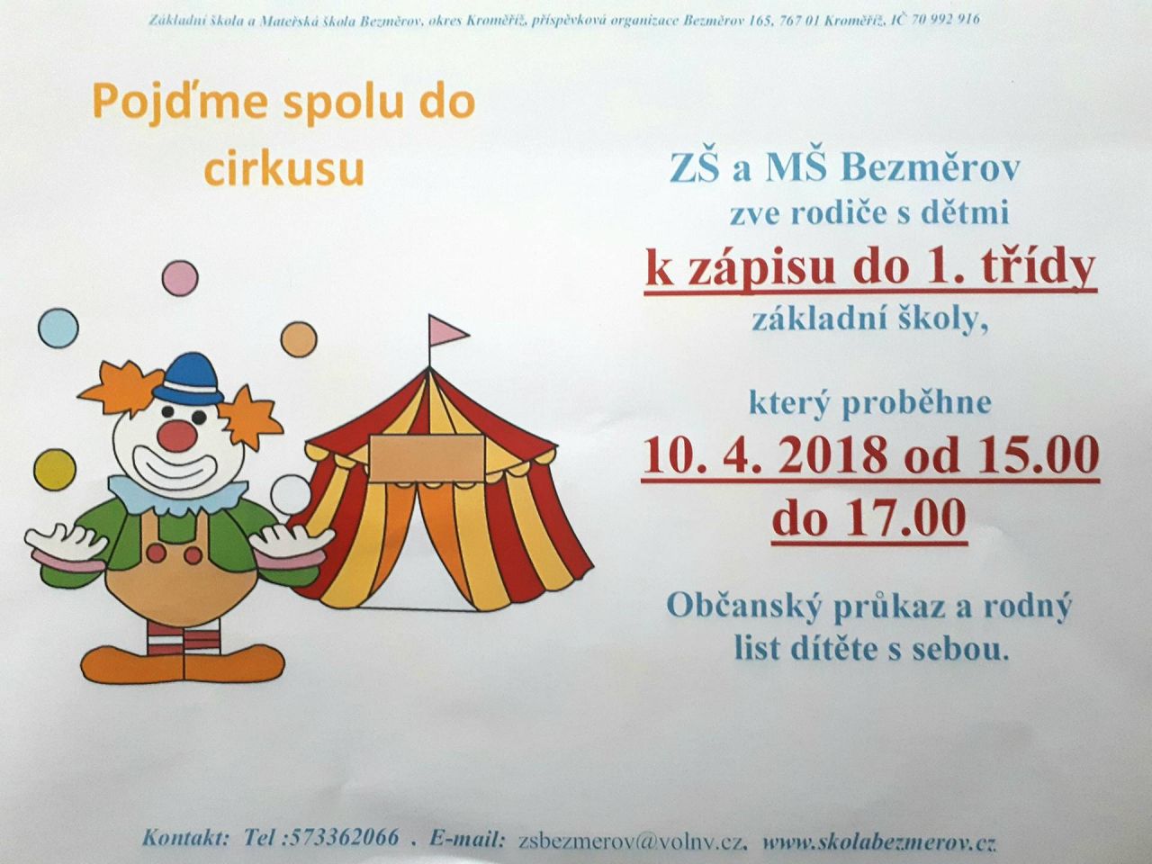 Zápis proběhne v 1. třídě ZŠ. Rodiče budou mít možnost seznámit se s materiálem, který žáci ve škole dostanou i s potřebami, které musí zajistit zákonný zásrtupce. Zákonný zásrtuopce obdrží také „desatero“, které by měl žák před nástupem do 1. ročníku znát.V přijetí mají přednost děti ze spádové oblasti, tzn. děti z MŠ Bezměrov
