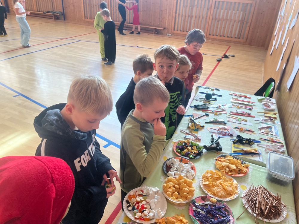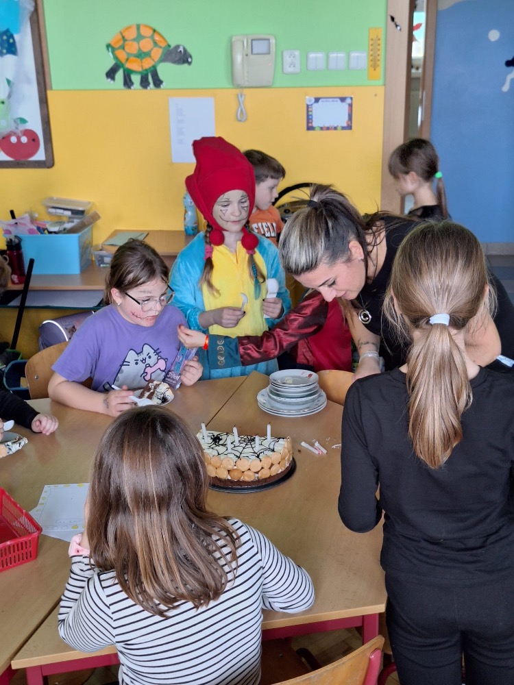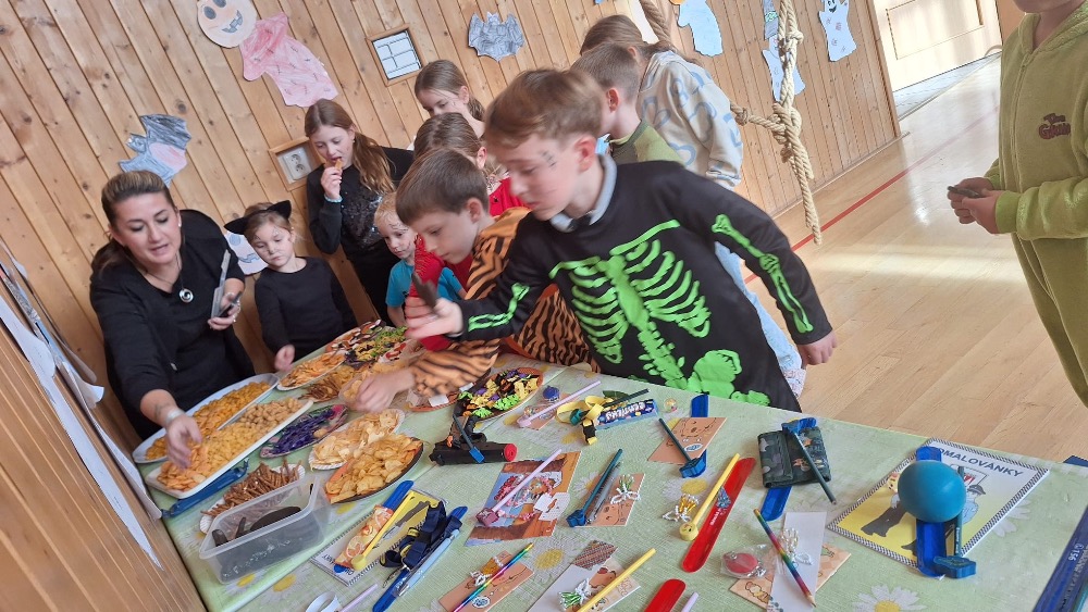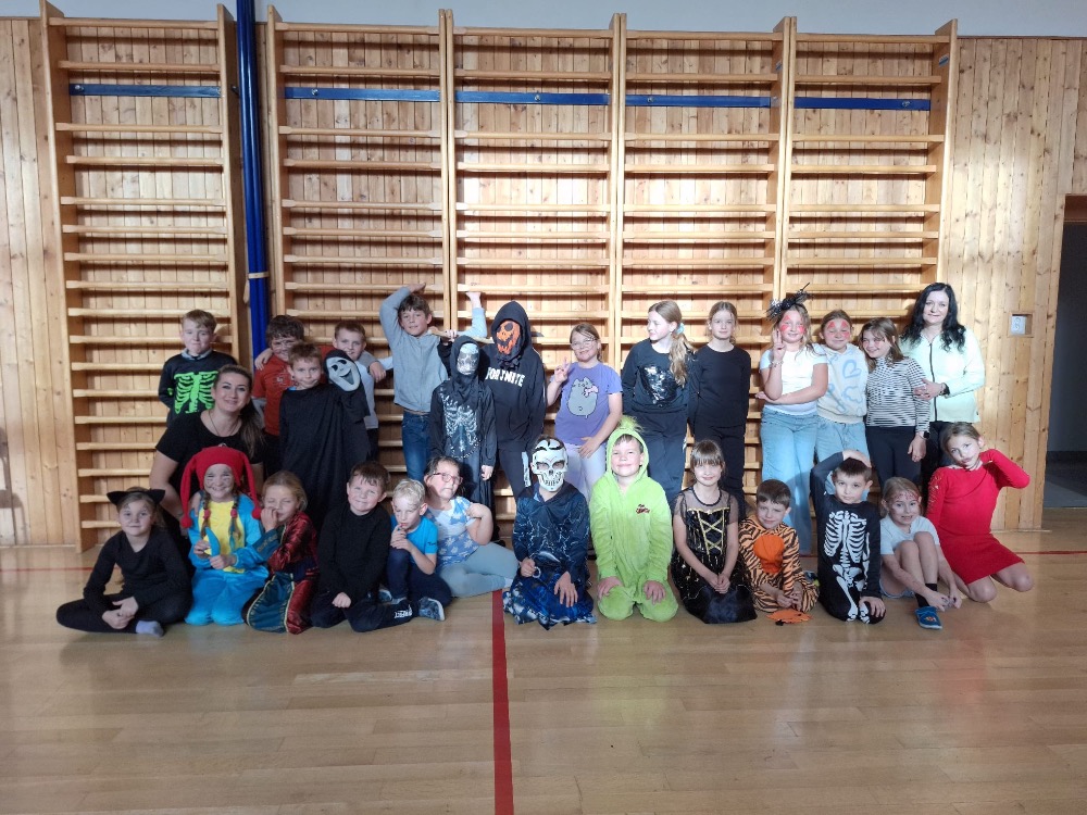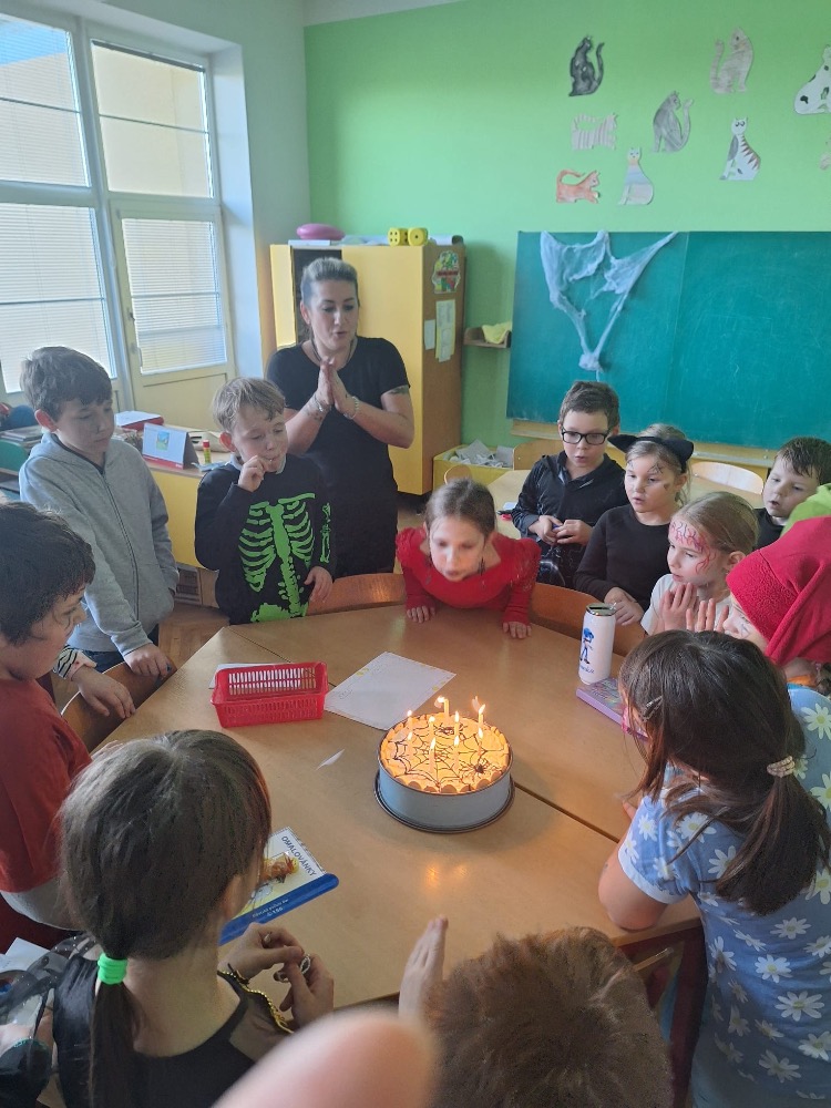 Máme konec října, nastal dušičkový čas a my ve školní družině opět slavíme „Halloween“ -v překladu „Předvečer všech svatých“. Abychom se chránili před zlými duchy, oblékli jsme se do strašidelných kostýmů a společně jsme se přesunuli do tělocvičny, kde se celá akce odehrála. Začali jsme jako zombíci, kteří tančí při strašidelné hudbě plné tajuplných a strašidelných zvuků. Následovala písnička o čarodějnicích, kterou dobře známe a pořádně jsme si zařádili. Odstartovali jsme s vysokým nasazením a stejně jsme i pokračovali. Rozdělili jsme se do dvou družstev a soutěžili jsme v halloweenském duchu dál, luštili jsme křížovky a hlavolamy, hledali jsme rozdíly, bloudili jsme v bludištích, kde hlavní úlohu hrály čarodějnice, pavouci, kostlivci, kouzelné lektvary nebo černé kočky. V přestávkách mezi disciplínami jsme si pochutnávali na brambůrkách a jiných dobrotách, které pro nás připravili maminky, za co jim velmi děkujeme. Nechybělo ani tancování na oblíbené písničky a tohle rozpohybované řádění v rytmu jsme si opravdu užili. Snad si to užila i naše milá kamarádka Lia, která se rozhodla oslavit své narozeniny společně s námi na halloweenské párty. Na závěr jsme oslavenkyni popřáli všechno nejlepší, dostala hobla a malý dáreček na památku od nás. Dort s čokoládovými pavoučky upečený maminkou byl lahodnou tečkou za zábavným odpolednem