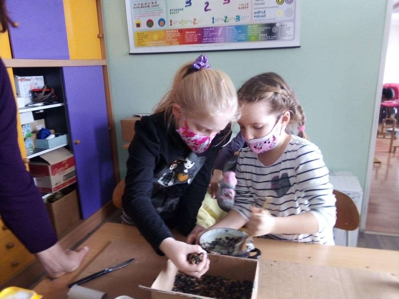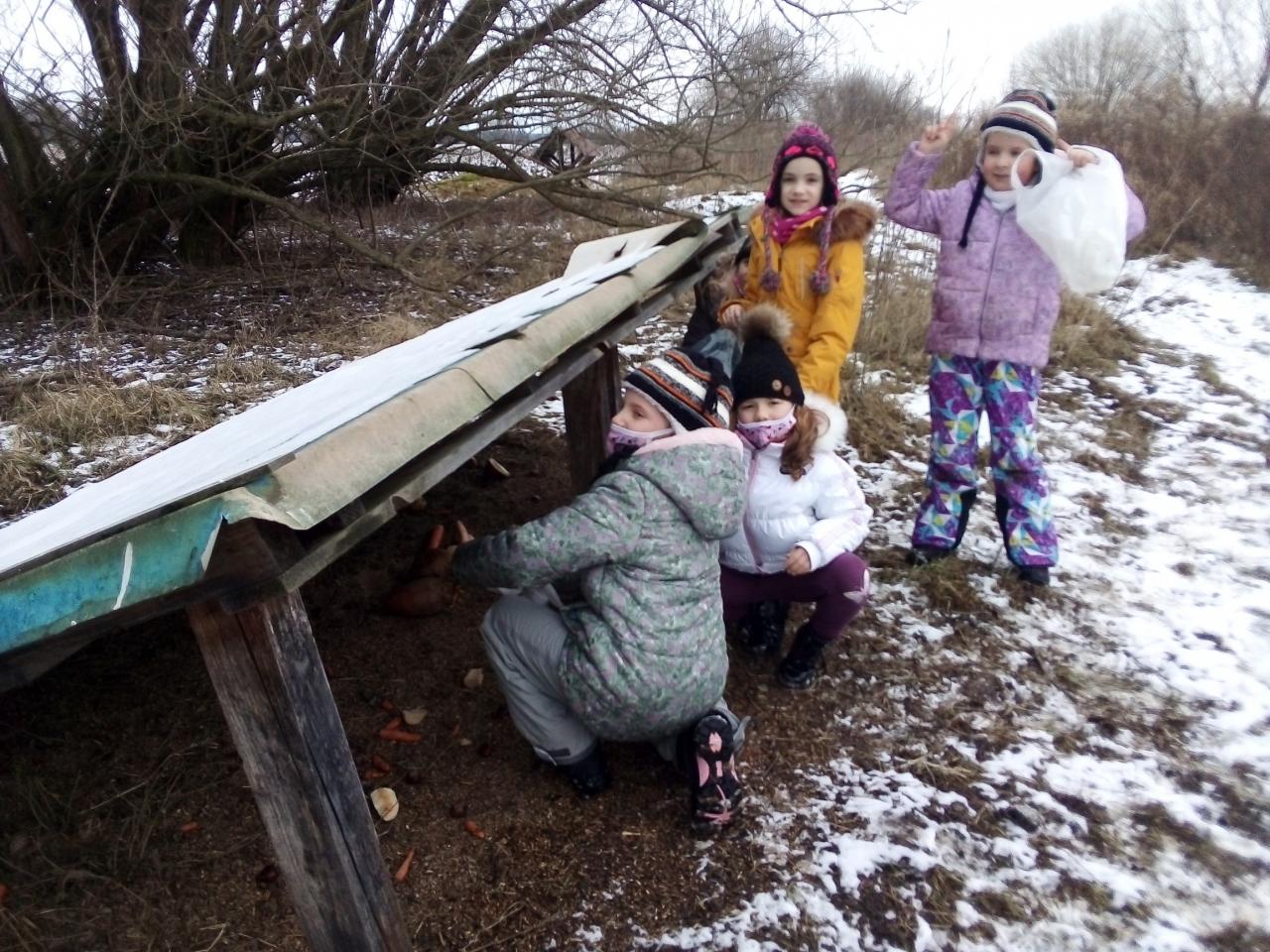 Zima je tu. Venku sněží, teploty padají pod nulu. Je proto ten pravý čas začít přikrmovat venkovní ptactvo. Pokud je zima tuhá a dlouhá, začínají strádat nedostatkem potravy a mnozí mohou i uhynout. Když jim nachystáme krmení, mnohdy jim můžeme zachránit život. Pro naše malé opeřence jsme vlastnoručně udělali krmítka plná semínek. Zrní, semena, olejniny a ořechy jsou pro ptáčky vyloženou pochoutkou. Těšíme se, až budeme společně za okny pozorovat sýkorky, brhlíky, strakapoudy a další ptáky, kteří si na dobrotách budou pochutnávat. Také jsme navštívili krmelec a zásyp, kde jsme zvířátkům na saních přivezli suché pečivo, jablíčka, mrkvičky a seno. Doufáme, že si také pochutnají.