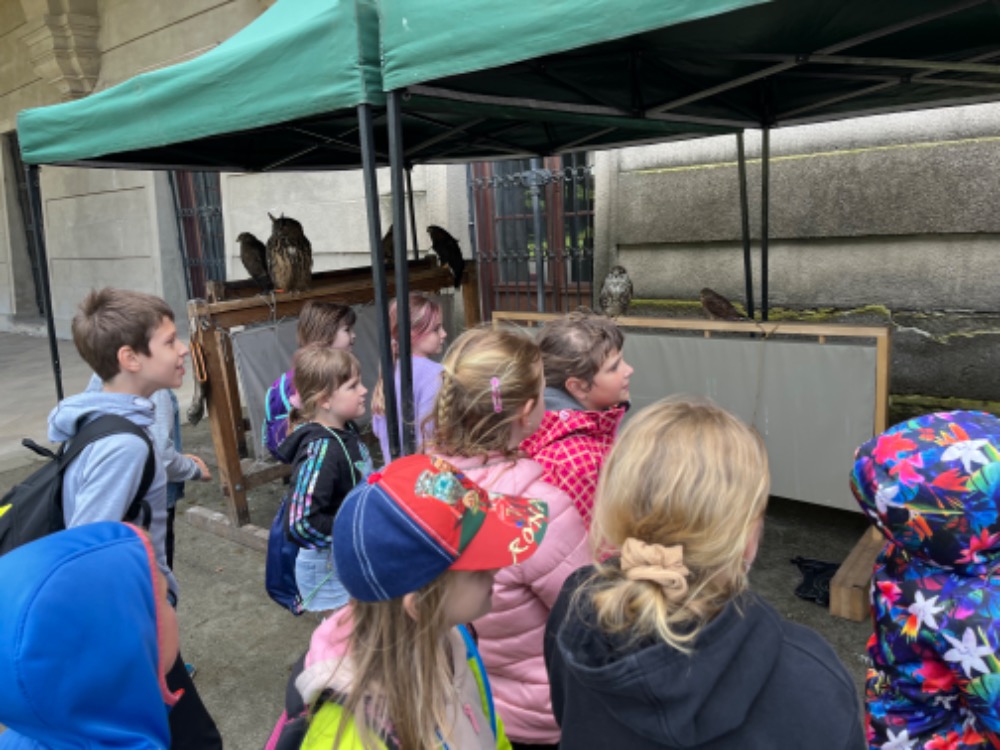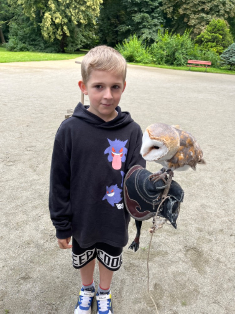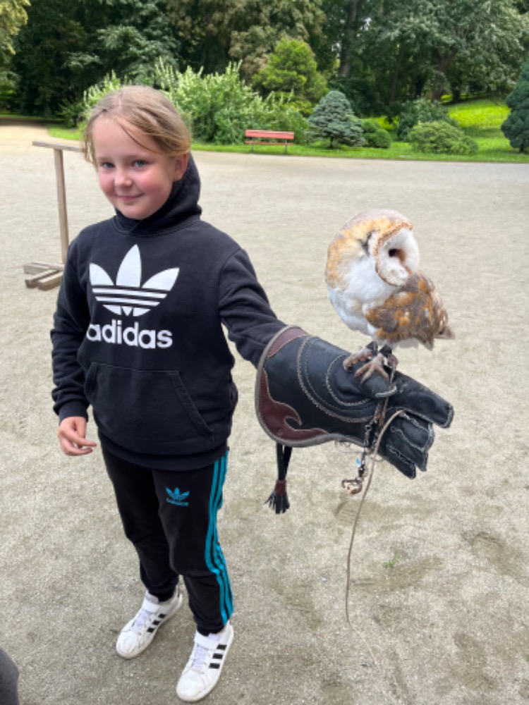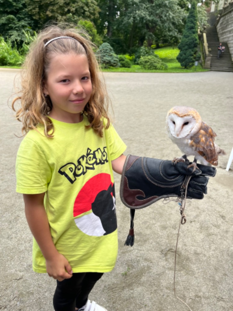 Třetím a posledním výletem bylo setkání se sokolníkem. Pan sokolník klukům a holkám vysvětlil, co je sokolnictví a seznámil je s životem dravců. Žáci si také mohli vyzkoušet přivolání dravce s příletem na rukavici, seznámili se s technikami výcviku dravých ptáků s důrazem na poslušnost při přistání. Žáci získali informace o tom, jak dravci loví, čím se živí, jak o ně sokolník pečuje nebo jak se chovají ve svém přirozeném prostředí. Mohli jsme si z blízka prohlédnout krahujce, poštolku, sovu pálenou, puštíka nebo výra velkého a nejen to, mohli jsme se s těmito nádhernými zvířaty vygotit. Cestou na vlak jsme si samozřejmě nezapomněli koupit zmrzlinu, ledovou tříšť, pizzu nebo jinou dobrotu, na kterou se všichni těšili.